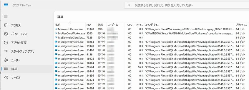 - 「msedgewebview2.exe」を特定し、その行にある「コマンド ライン」列の内容を確認してください。